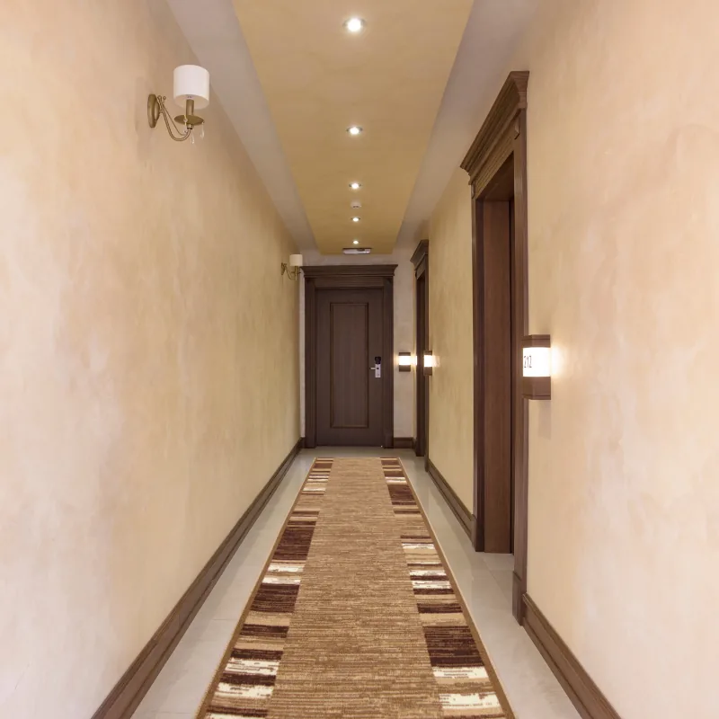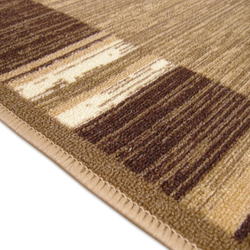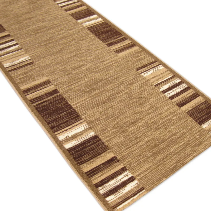 Chodnik posiada minimalistyczny wzór w kolorze beżowym, z brązowymi dodatkami, świetnie sprawdzi się w przedpokoju, chroniąc podłogę przed piaskiem i wilgocią wnoszoną z zewnątrz, w kuchni, gdzie zapewni stabilność podczas gotowania, sprawdzi się także na schodach, zwiększając bezpieczeństwo poruszania się.