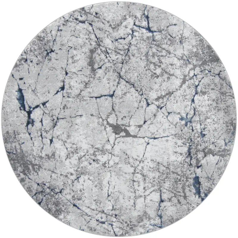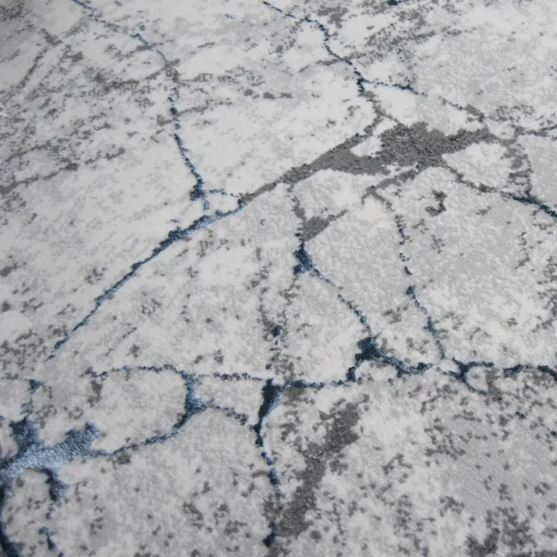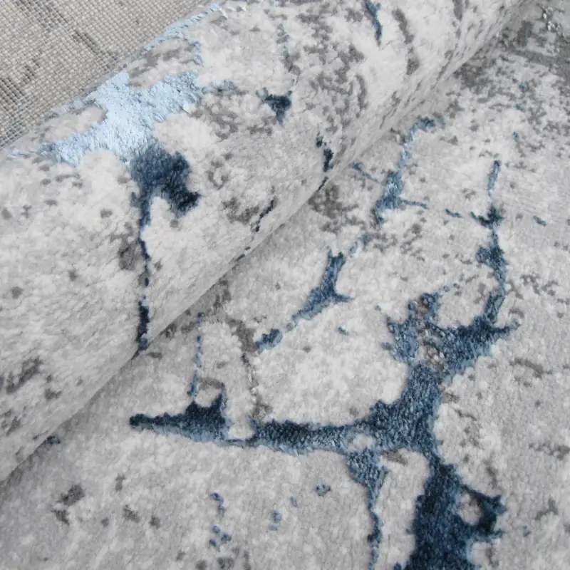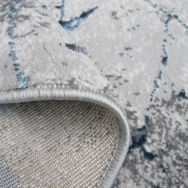 Dywan okrągły glamour Luna z błyszczącą nitką w kolorze szaro niebieskim i dwupoziomowym wzorem 3D inspirowanym marmurowym motywem kamienia wnosi do wnętrza odrobinę luksusu w nowoczesnym stylu. Ta stonowana, a zarazem wyrazista kolorystyka i opływowy kształt doskonale ożywi neutralne aranżacje lub dopełni przestrzeń w klimacie industrialnym i nowoczesnym.