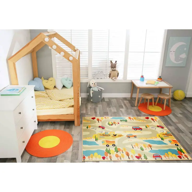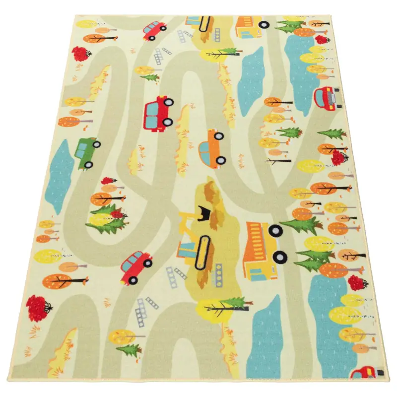 Zamień pokój dziecka w tętniące życiem małe miasteczko! Nasz dywan dziecięcy z krótkim włosiem w kolorze beżowym to nie tylko stylowy dodatek do wnętrza, ale także inspirująca przestrzeń do zabawy i nauki. Wzór przedstawiający ulice, samochody, drzewa i alejki pobudza wyobraźnię i zachęca do kreatywnej zabawy samochodzikami, figurkami czy klockami.