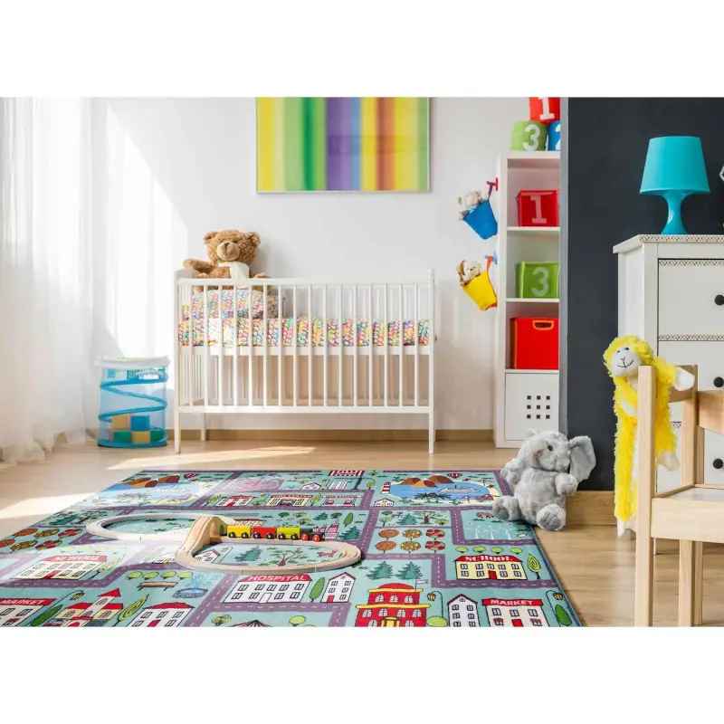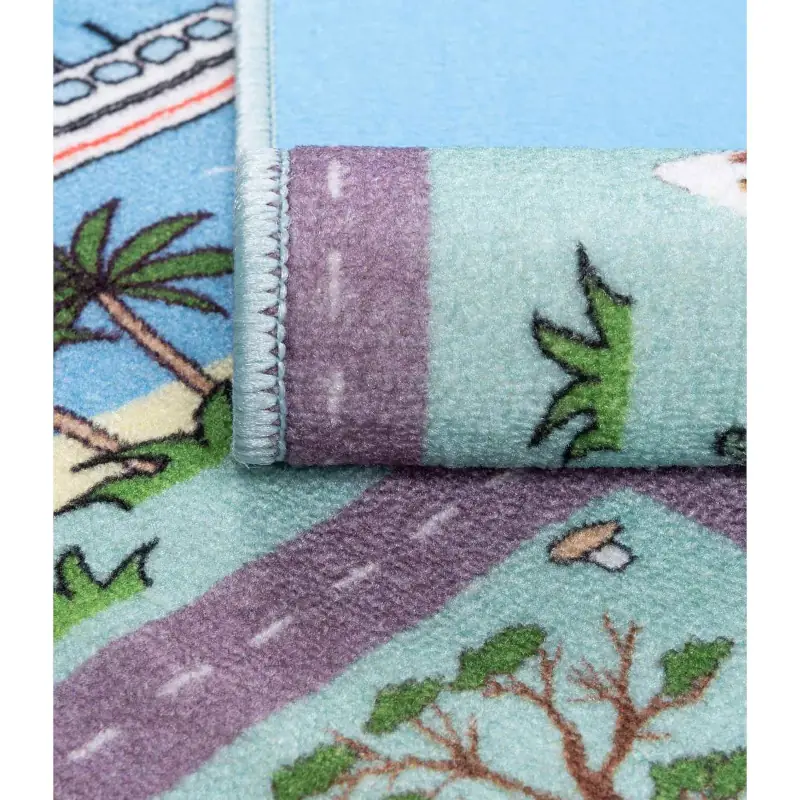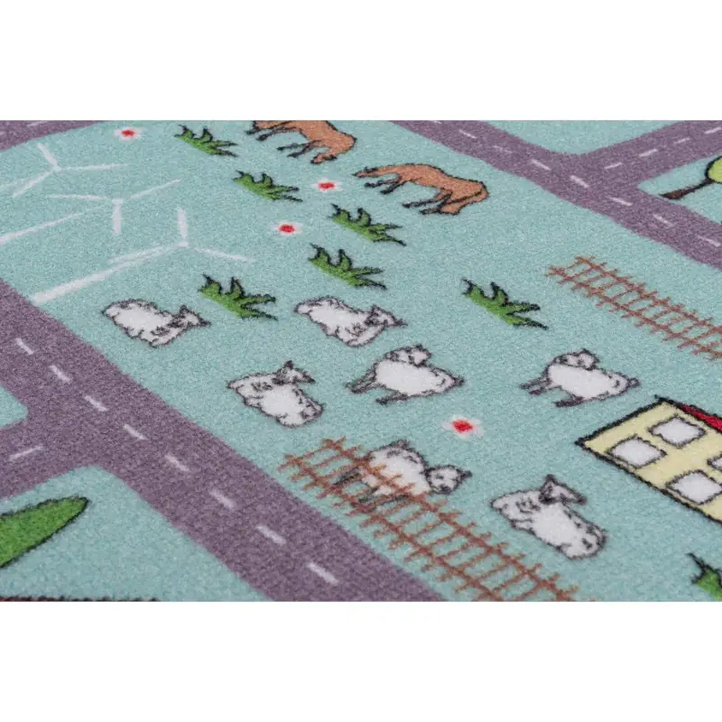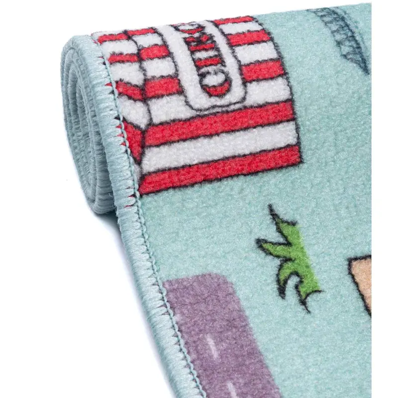 Zaproś dziecko do świata wyobraźni, gdzie codzienne życie toczy się wokół małego miasta! Ten wyjątkowy dywan dziecięcy w kolorze morskim z krótkim włosiem przedstawia urokliwe miasteczko z domkami, szpitalem, szkołą i marketem - idealne tło do zabawy samochodzikami, figurkami czy zestawami edukacyjnymi.