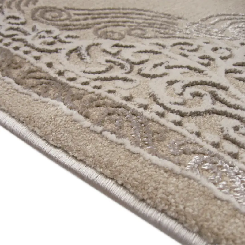 Beżowy dywan Elite 3935 o klasycznym wzorze z rozetą, który łączy tradycyjną estetykę z delikatnym akcentem błyszczących nitek, nadających głębi wzoru przy zmieniającym się świetle. Neutralna tonacja beżu tworzy spokojne tło dla mebli i dodatków, podkreślając elegancję wnętrza bez nadmiernej dominacji. Miękkie, gęste runo z efektem 3D zapewnia komfort chodzenia i poprawia izolację akustyczną. Produkt zaprojektowany z myślą o trwałości i łatwej codziennej pielęgnacji, idealny do salonu, sypialni i gabinetu.