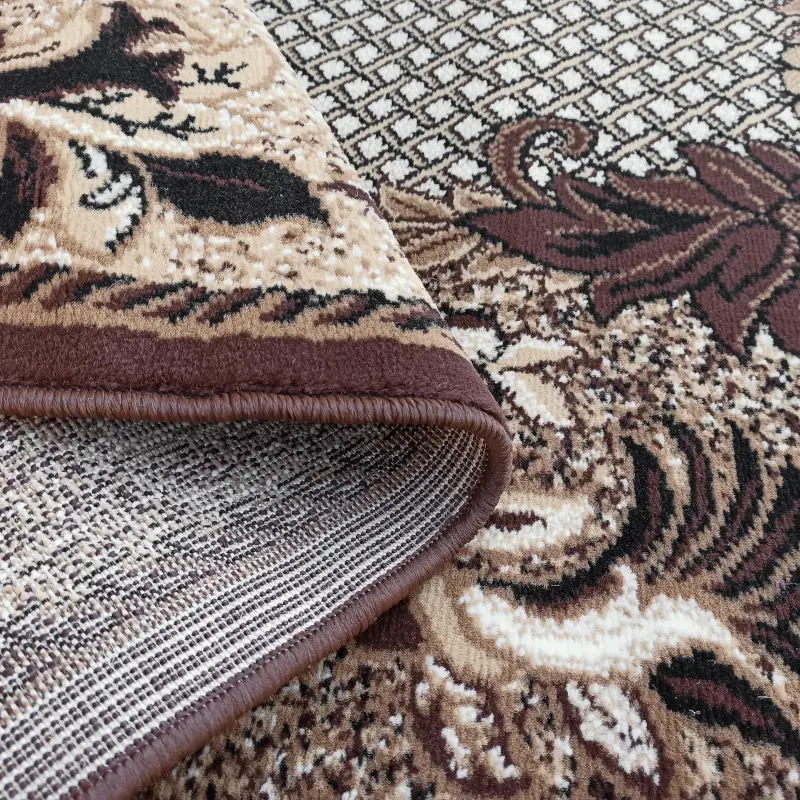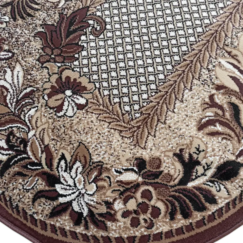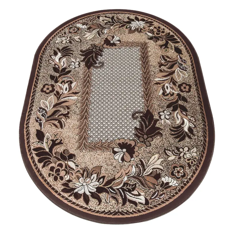 Wyjątkowy brązowy dywan owalny Venezia z wzorem kwiatowym, przełamanym stylową kratką na środku. To harmonijne połączenie natury, geometrii i owalnego kształtu sprawia, że dywan prowadzi wzrok wzdłuż swoich opływowych linii, staje się również dekoracyjnym punktem pomieszczenia. Beżowo-brązowa kolorystyka świetnie komponuje się z drewnianymi meblami, jasnymi dodatkami czy minimalistycznymi aranżacjami. Owalny kształt dywanu idealnie ożywia przestrzeń, doskonale sprawdzi się zarówno w salonie, jak i w jadalni czy gabinecie, nadając wnętrzu bardziej miękkiego charakteru.