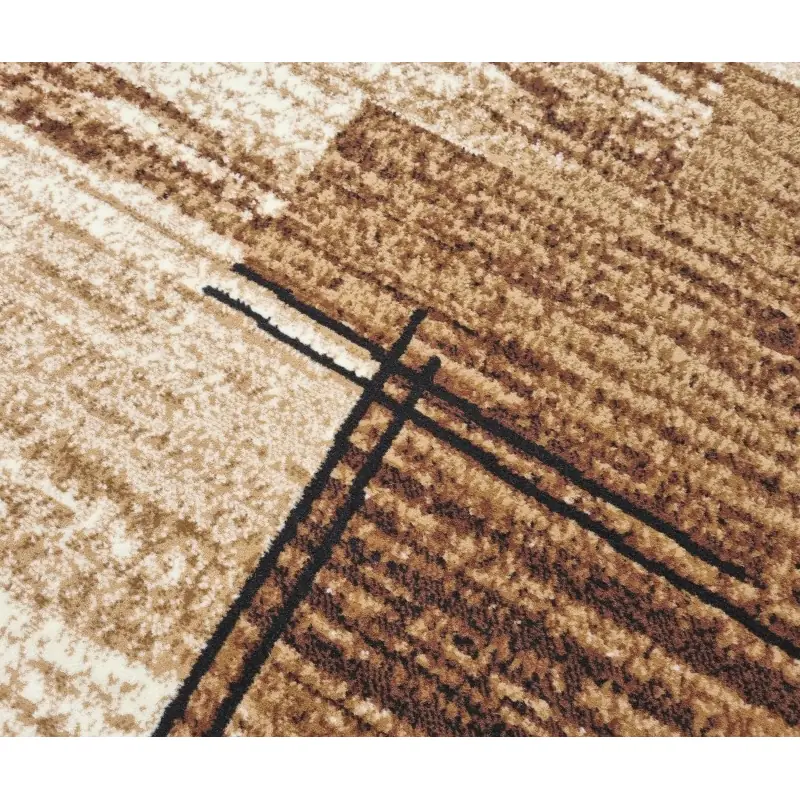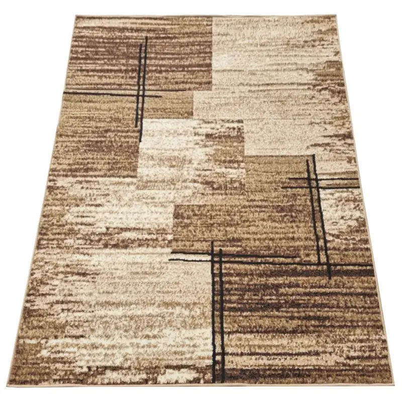 Jeśli szukasz dywanu, który przyciąga wzrok i nadaje wnętrzu wyrazistości, ten model z geometrycznym wzorem będzie strzałem w dziesiątkę. Beżowa baza została przełamana mocniejszymi akcentami w odcieniach brązu i czerni, co tworzy efektowną, a jednocześnie elegancką kompozycję.
