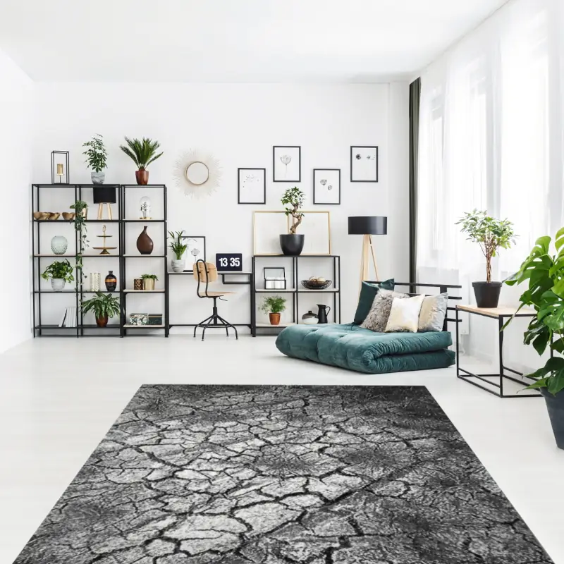 Nowoczesny dywan szary do salonu z wyjątkowym wzorem imitującym spękaną ziemię to wyjątkowa dekoracja podłogi, która odmieni wystrój każdego wnętrza. Jego specjalnie zaprojektowany design inspirowany naturalnym pięknem przyciąga uwagę, a jednocześnie pozostaje stonowany i elegancki.