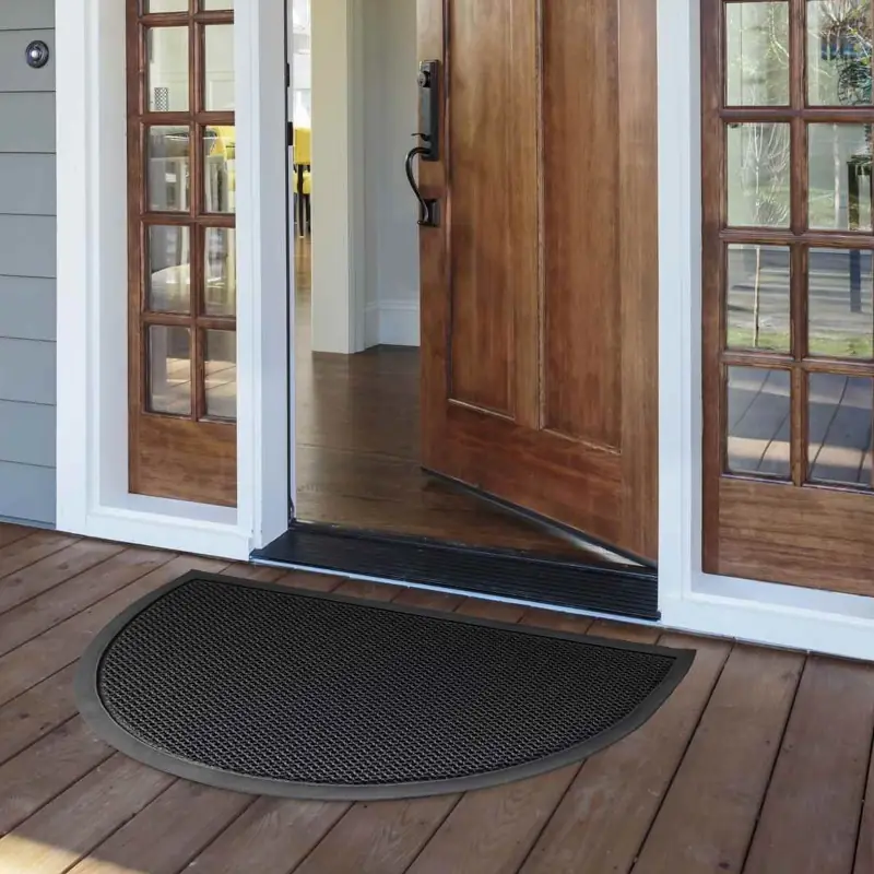Elegancka i funkcjonalna półokrągła wycieraczka wejściowa z innowacyjną strukturą 3D. Jej wierzchnia warstwa wykonana z gęstego sznurka tworzy trójwymiarową, wypukłą siatkę, która skutecznie zatrzymuje błoto, piasek i wilgoć. Ergonomiczny półokrągły kształt idealnie dopasowuje się do łukowatych wejść, drzwi tarasowych lub klasycznych, zapewniając estetyczne wykończenie przestrzeni. Spód z wytrzymałej gumy gwarantuje stabilność, nie przesuwa się i chroni podłogę przed wilgocią. Wycieraczka jest całkowicie nieprzemakalna, odporna na ścieranie i łatwa w czyszczeniu – wystarczy ją wytrzepać lub przemyć wodą. Uniwersalny czarny kolor pasuje do każdego wejścia. Doskonała do zastosowań domowych, biurowych i komercyjnych.